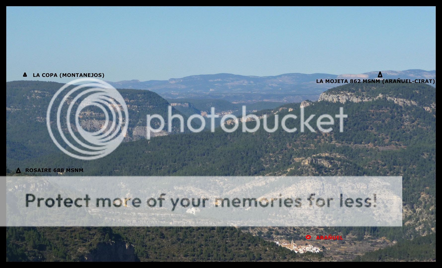 | FOTO CON INDICACONES DE ALGUNAS MONTAÑAS Y POBLACIONES DESDE EL MIRADOR DE LA NOGUERICA, EL PUEBLO QUE SE VE EN LA FOTO ES ARAÑUEL A 3 KM DE CIRAT POR LA CV-20, SE DIVISA EL MONTE COPA DE MONTANEJOS Y LA MOJETA-MAGRAILE DE ARAÑUEL, TAMBIÉN EL MIRADOR DE ROSAIRE DE CIRAT, AL FONDO LAS MONTAÑAS DE CORTE DE ARENOSO Y RUBIELOS DE MORA, NOGUERUELAS, ETC. |
